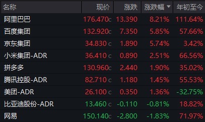 除了阿里巴巴之外,京东、拼多多、百度等中概科技股也纷纷跟涨。京东涨幅超过5%,拼多多和百度涨幅均超过1%,显示出中概股整体向上的趋势。